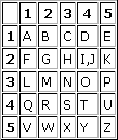 Это сообщение записано при использовании латинского варианта Квадрата Полибия, в котором буквы расположены в алфавитном порядке.